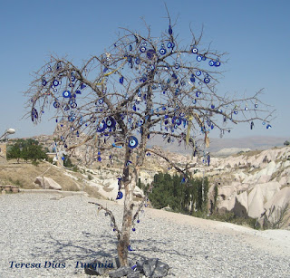 Gostei de ver esta árvore decorada com os olhos turcos.